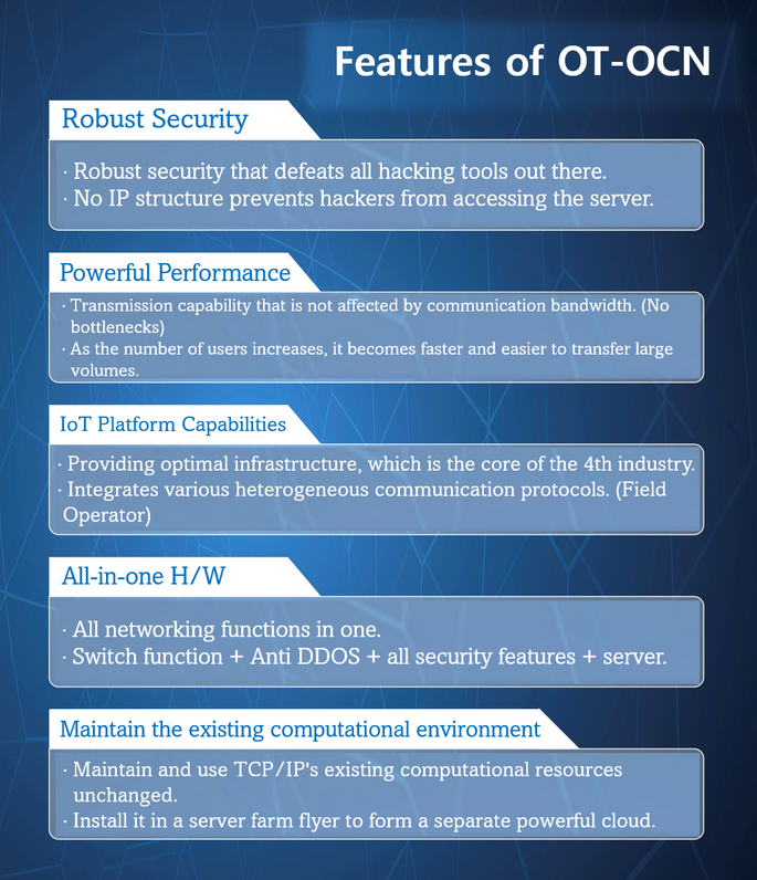 OT-OCN (Operation Technology Operation Centric Network) is a new paradigm-based next-generation communication security platform (Infrastructure Platform) optimized for the future IT industry to solve various weaknesses of TCP/IP, the current Internet communication protocol.